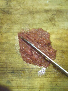 ②梅をたたいてペースト状にする。